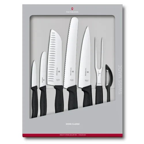 7-delni kuhinjski set Victorinox združuje različne vrste nožev za popolno pripravo vsake jedi. Izdelani so iz visokokakovostnega nerjavečega jekla, primerni za pomivalni stroj in ergonomsko oblikovani za udoben oprijem.