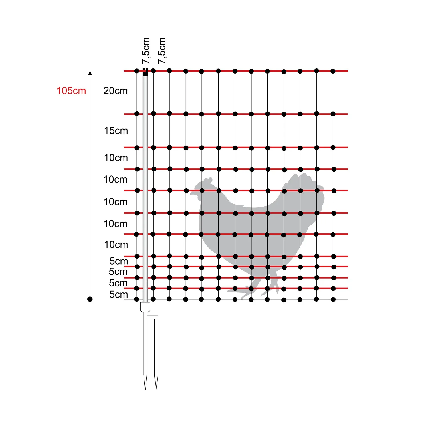 Električna mreža je dolgo 50 m in visoka 105 cm, zaradi česar je popolna ograja za perutnino, piščance, race, gosi, prepelice in druge male živali. Izjemno odporna vozlišča in tesno razporejena okenca mreže zagotavljajo, da nobena perutnina ali druge vrste malih živali enostavno ne morejo zdrsniti skozi ogrado. Je torej odlična ograja ali mreža za ograjo pri živalih, a tudi plenilci ne morejo notri. Rumena barva je zlahka prepoznavna tudi ponoči, saj je v nasprotju z zeleno barvo okolice.