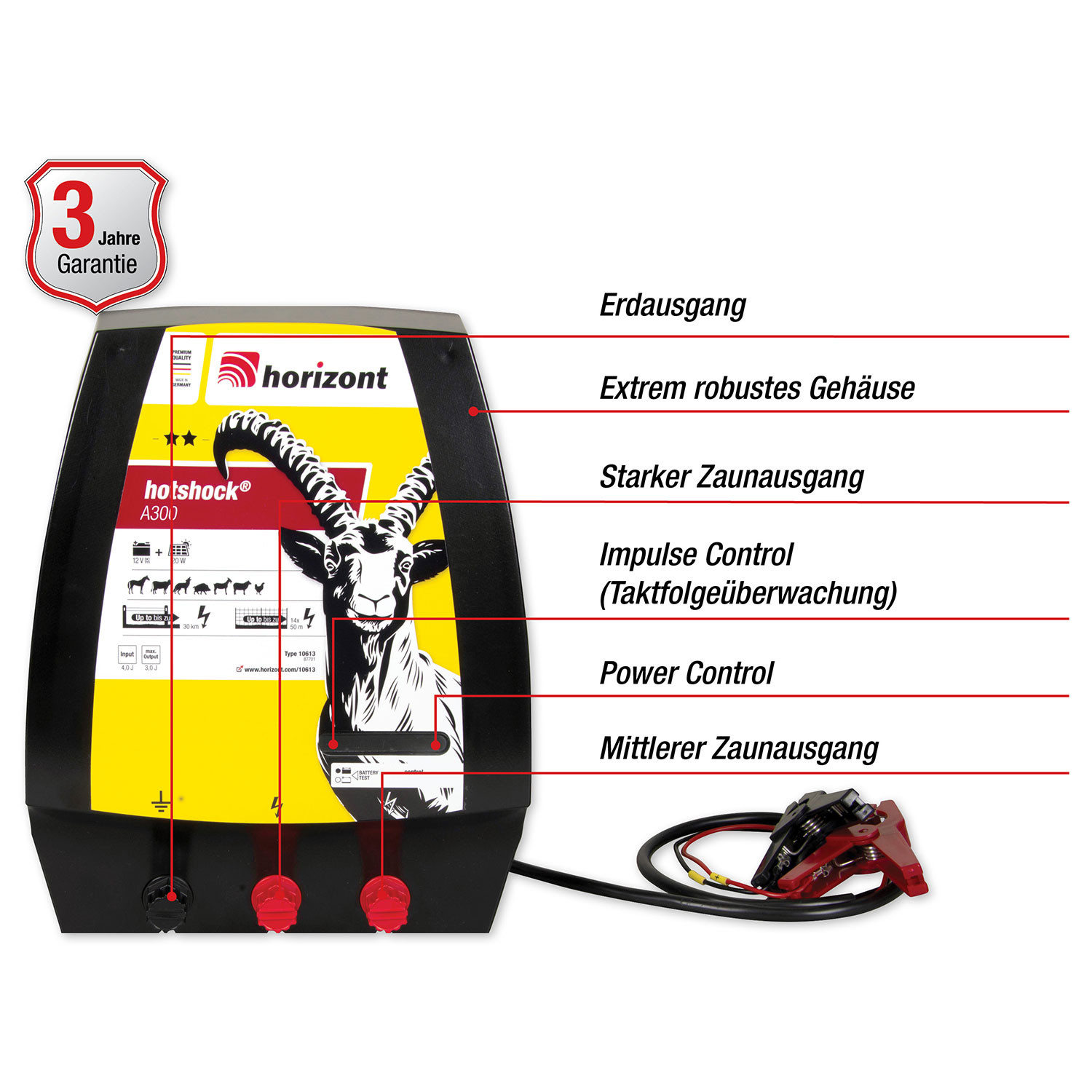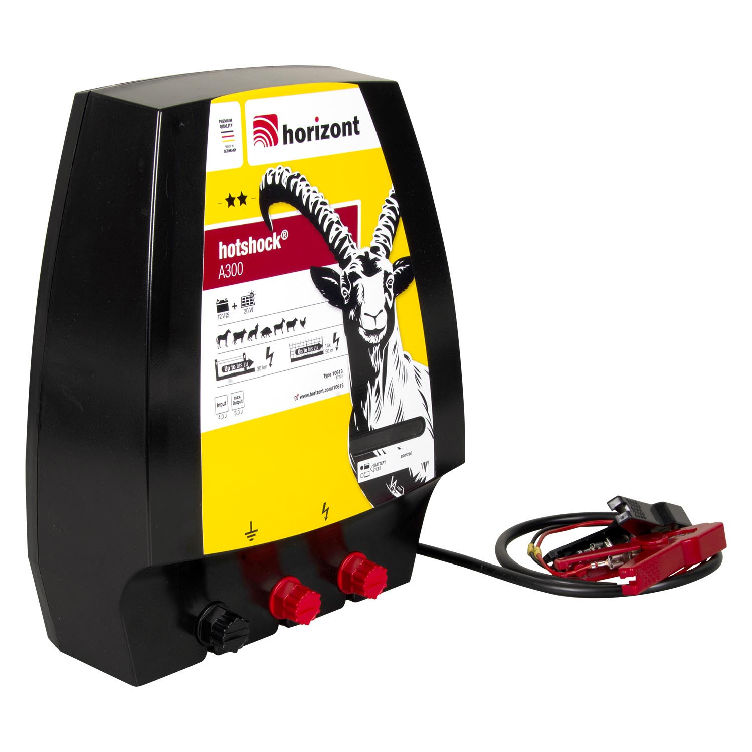 Akumulatorski električni pastir Horizont Hotshock A300 je primeren za konje, govedo, prašiče, perutnino, srnjad, volkove, ovce in koze.