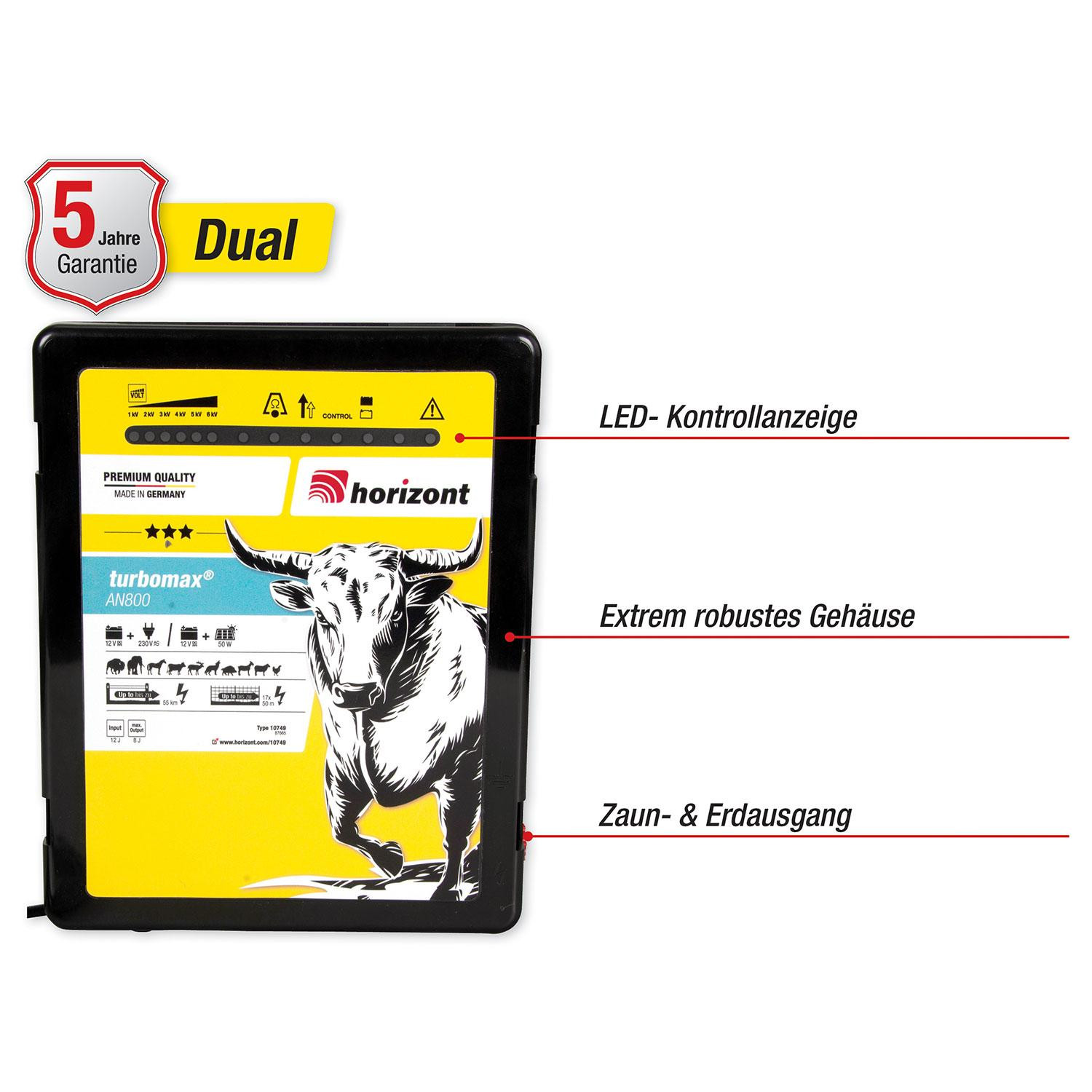 Električni pastir Horizont Turbomax AN800 Dual je izdelan iz visoko kvalitetne plastike in je odporen na UV žarke, stik z olji, udarce, stik z vodo in imajo torzijsko odpornost. To zagotavlja, da bo električni pastir zanesljivo delal več let, kar potrjuje 5 let garancije na izdelek. Testirano in narejeno v skladu z veljavno EU zakonodajo in varnostnimi standardi EN 60335-7-76 in DIN EN ISO 9001.